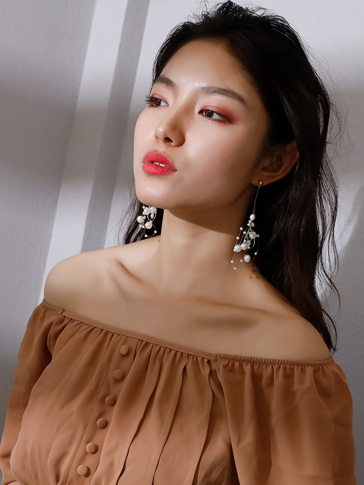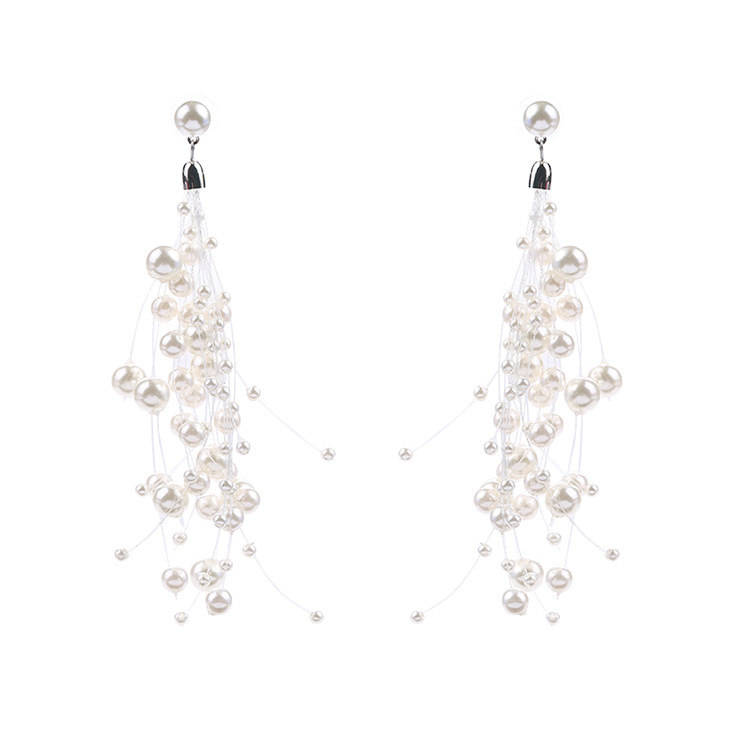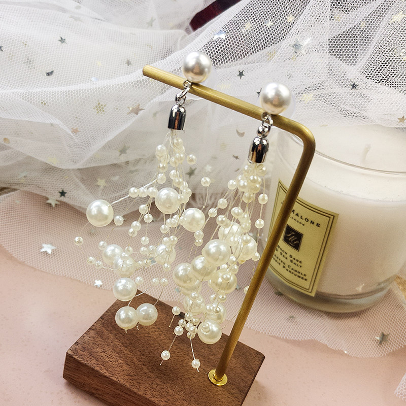 Temperament Super fairy size pearl earrings female Korean version of Joker multi-layer fish line beaded tassel earrings ear pin ear jewelry