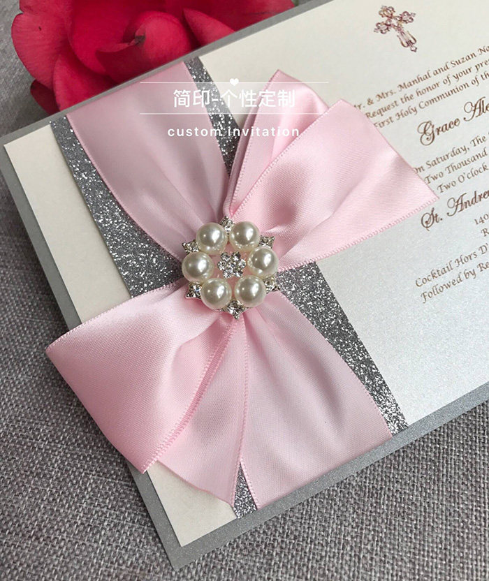 Pink Custom Wedding Invitation Ribbon Pearl Buckle Decoration Wedding Cards