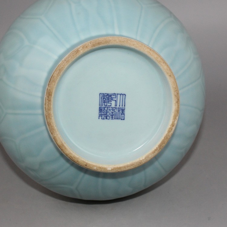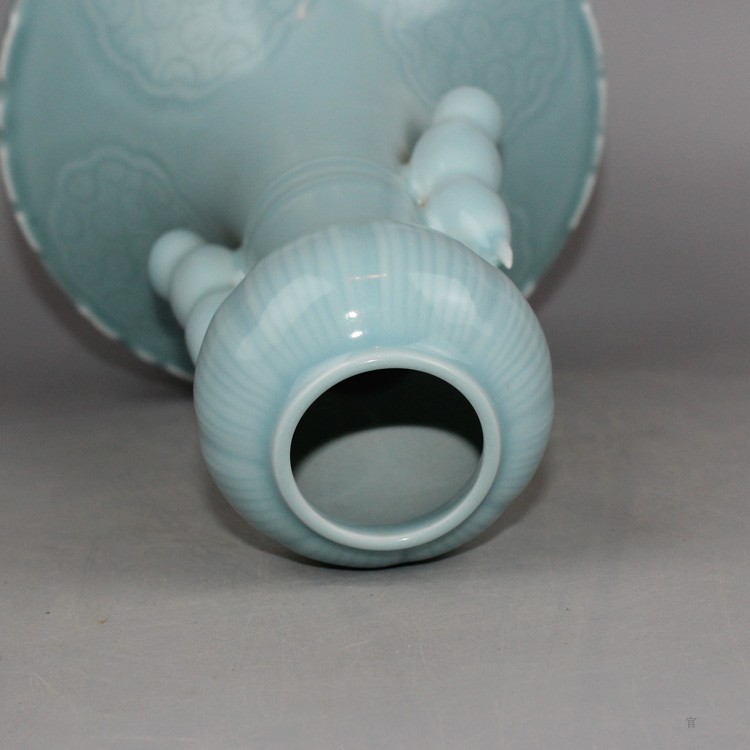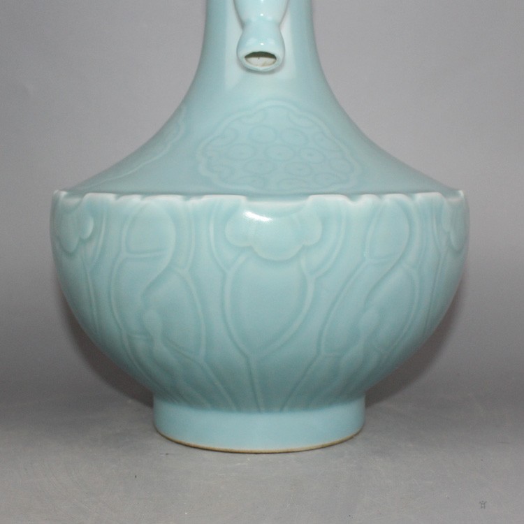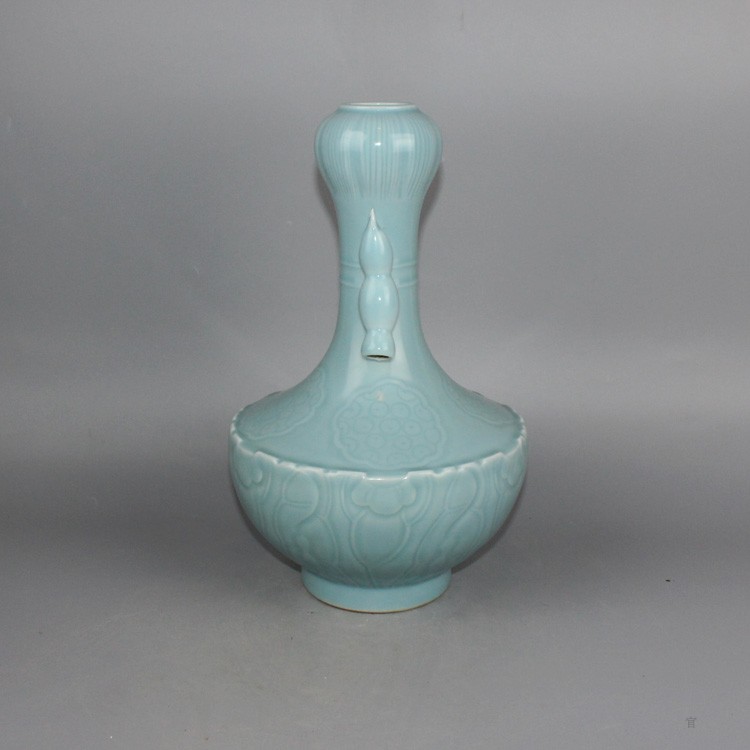 Qing sky green glaze double lotus root garlic bottle knife engraved blue and white six-character antique collection home decoration