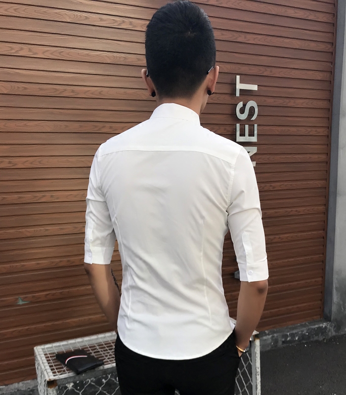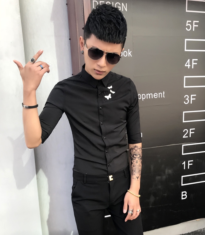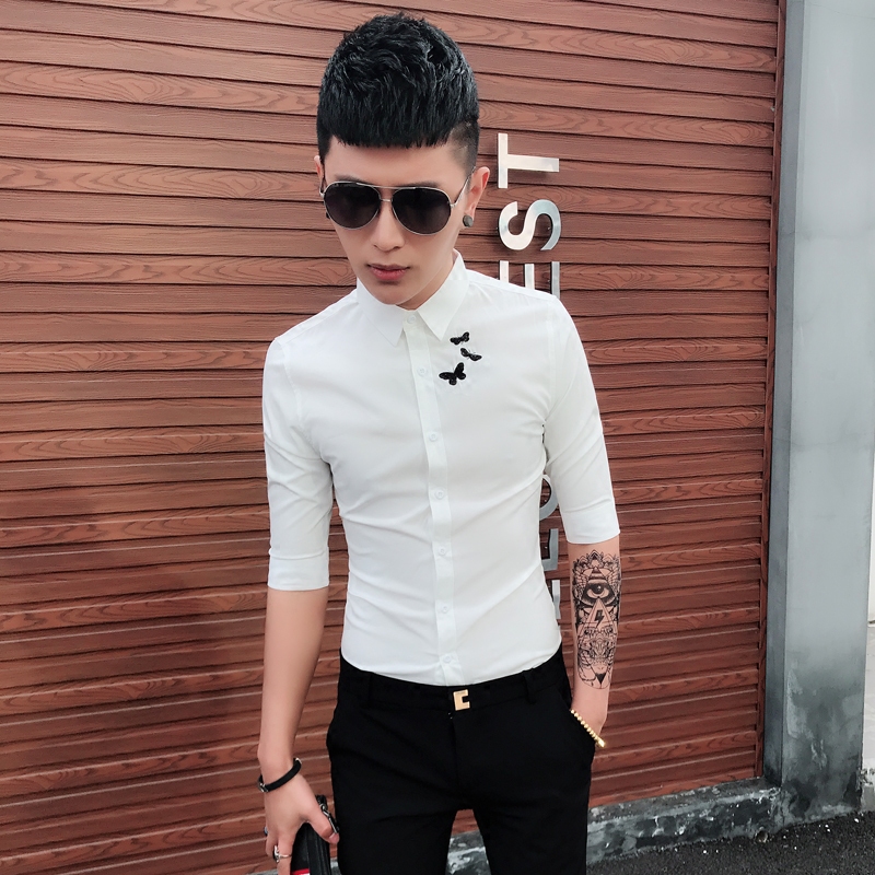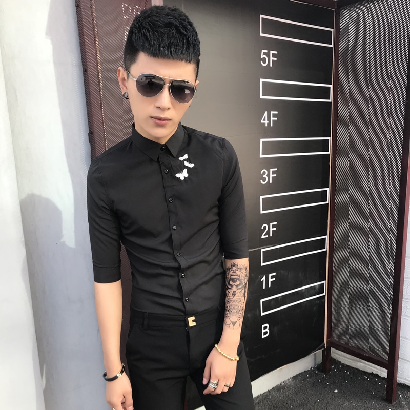 2021 new men's embroidered five-point sleeve shirt male handsome casual hair stylist five-point sleeve shirt slim youth trend