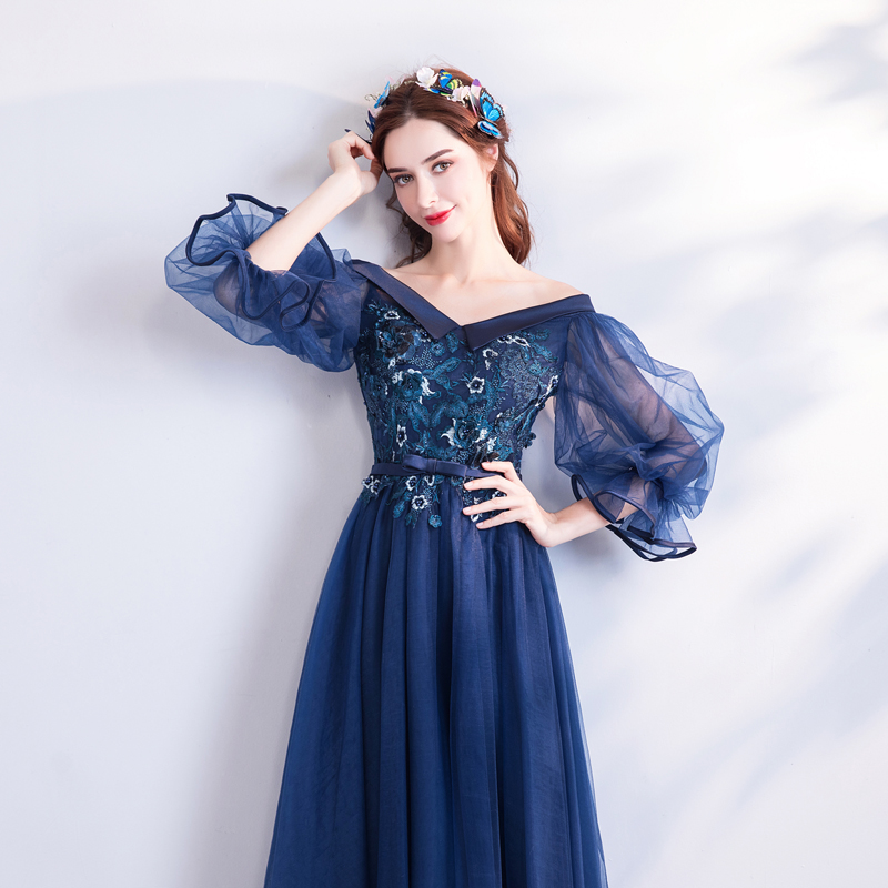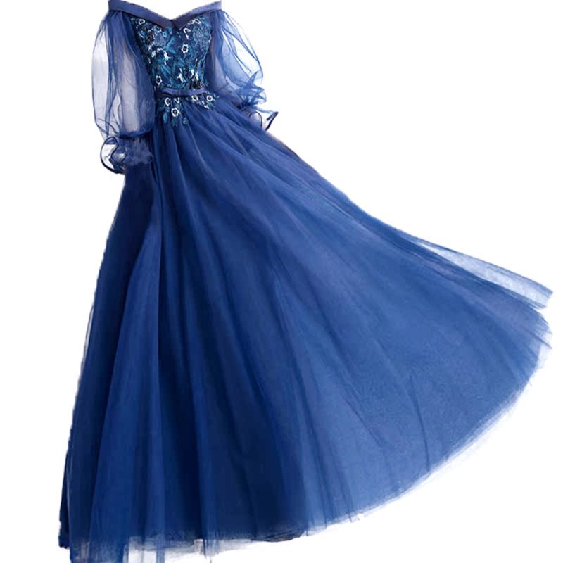 Morden Blue Fan-style Long Sleeve Dinner Party Annual Conference Stage Performance Car Show Walking Show Host Wedding Gown 2299