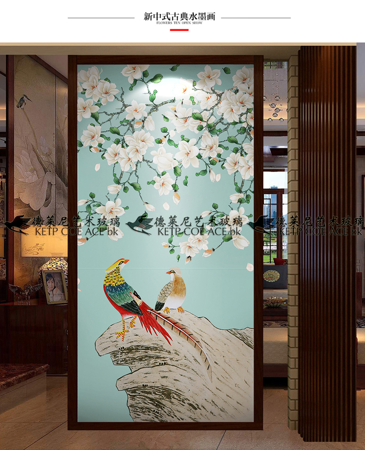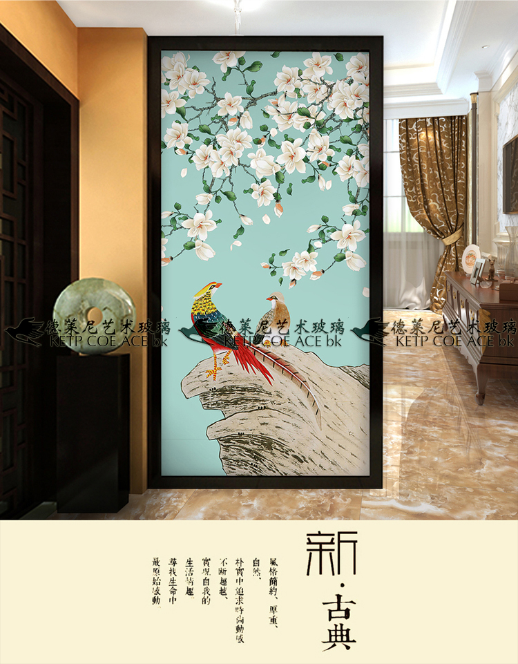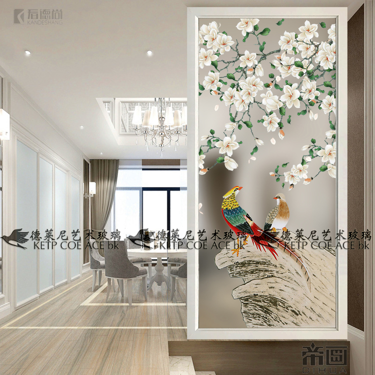 Art glass light and luxurious decorative screen partition living room Xuanguan modern Sino-American style frosted light transmission bifacial jade and bird
