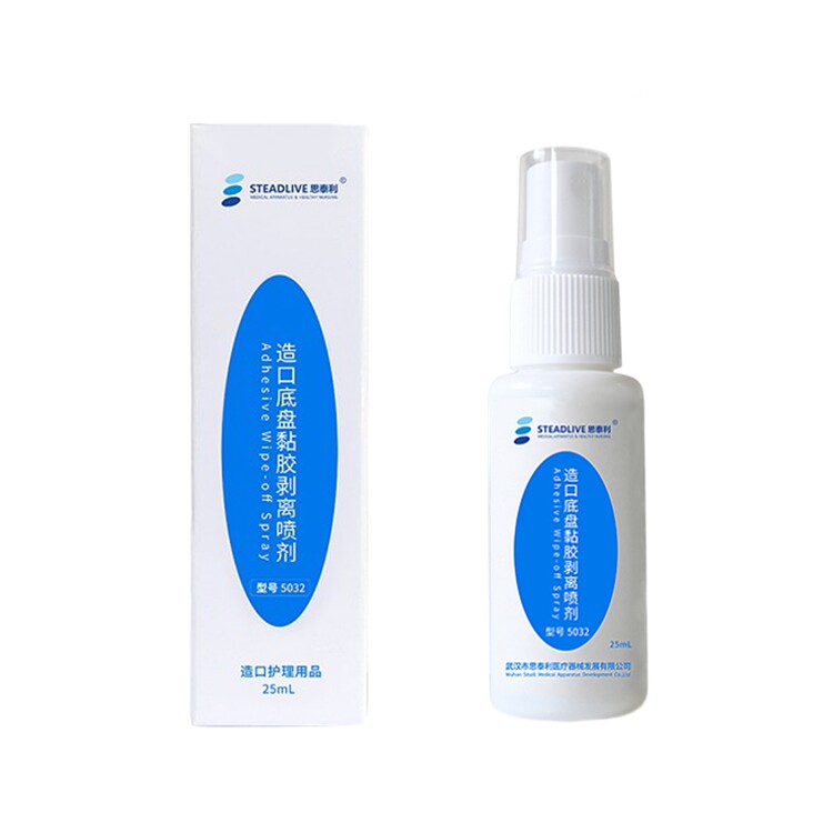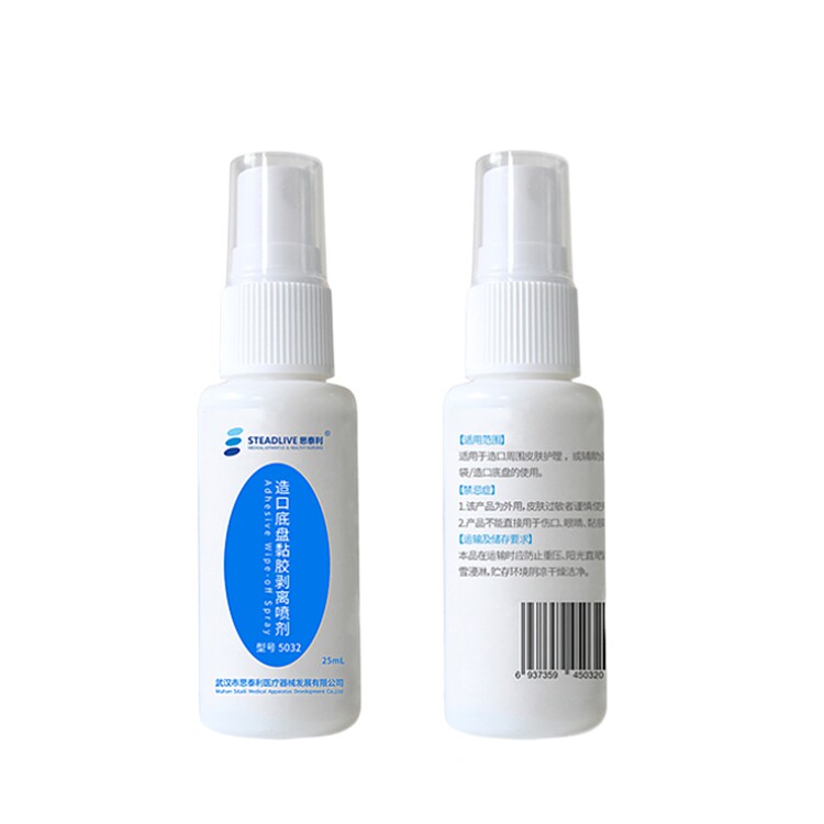 Staley stoma chassis adhesive stripping spray 5032 to remove adhesive residue without irritation ostomy bag 5033
