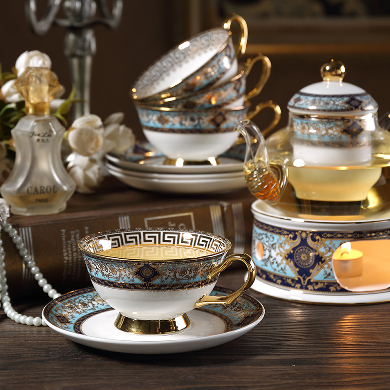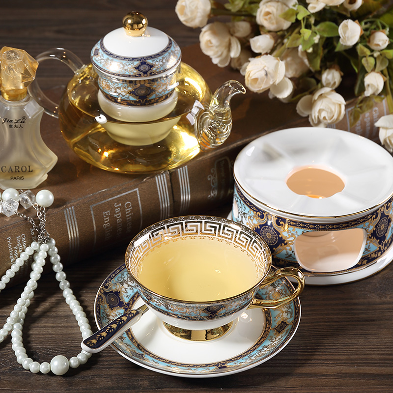 Posimi Blue Eurostyle Bone Porcelain Flower Tea Set Group Creative Candle Heating Base Glass Flower Teapot Tea Cup