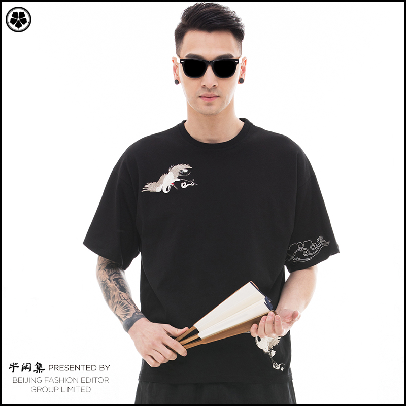 Semi-idle set "White Crane" Twin Fairy Crane Summer Fashion Embroidery T-shirt Tide Men's China Wind Round Collar Short Sleeve Blouses-Taobao