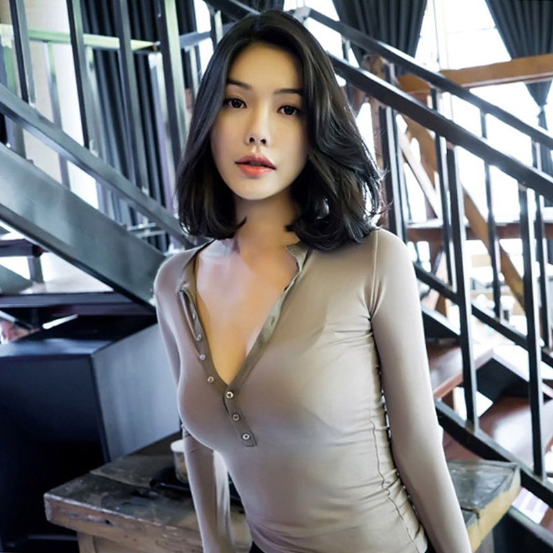 Elastic Tight Fit Lean Deep V Collar Low Chest Blouse Women Dress Cd Changing Dress Fake Lady Long Sleeve T-Shirt 100 Lap Sexier Undershirt