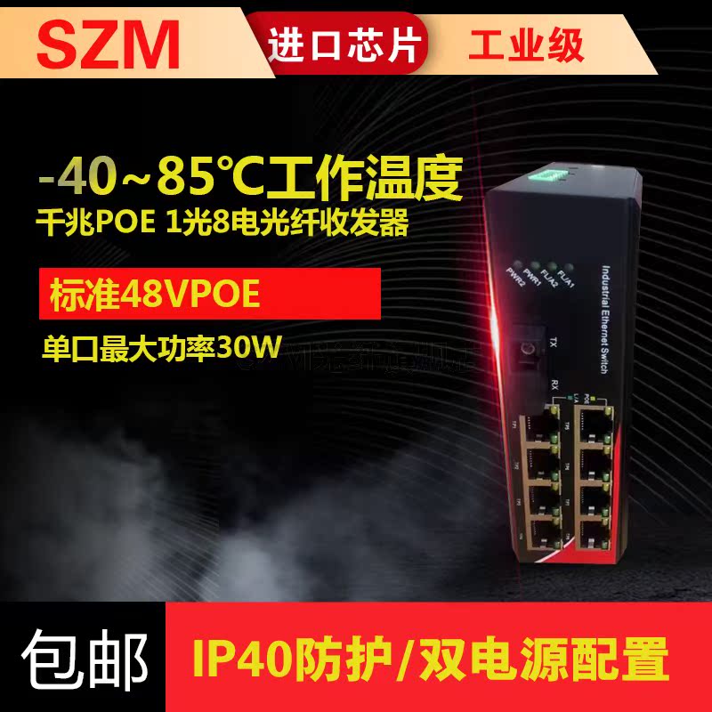 Industrial POE Fiber Switch Gigabit 1 Optical 8 Electrical POE Switch 48-56V rail type with power supply