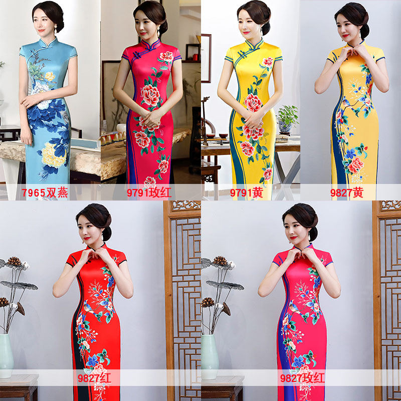 Long cheongsam 2021 new female positioning flower large size retro slim catwalk performance improved dress summer