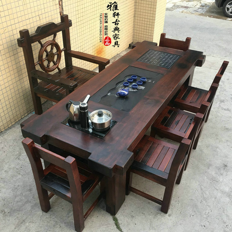 Old boat wood tea table chair group of Chinese style solid wood imitation ancient furniture living room minimalist Gongfu tea Several tea table tea table and chairs