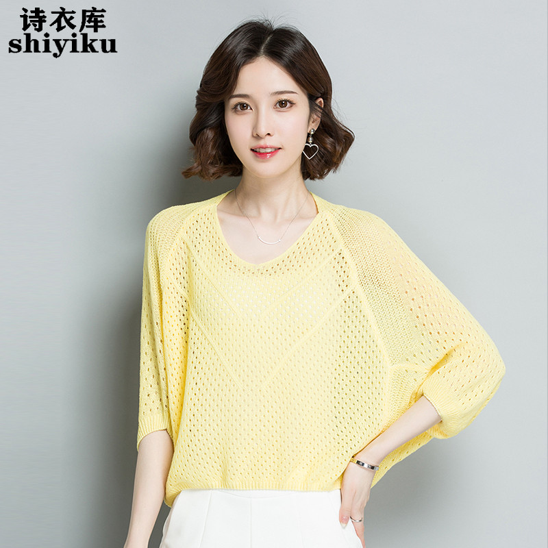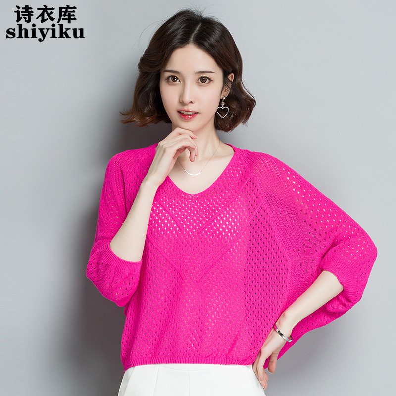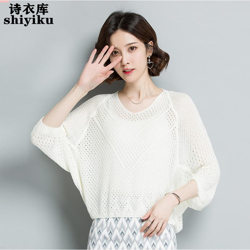 Bat shirt ice wire tops girl short 2023 summer new tide Han edition loose skinny hollow knitting shirt