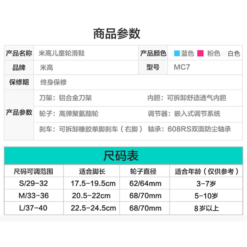S code (29-32) suitable for 3-7-year-old M code (33-36) suitable for 5-10L code (37-40) suitable for over 8 years of age