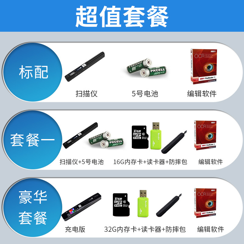 Standard (scanner, battery, software) Package 1 (scanner, 32G memory card, anti-fall bag, battery, software), borderless scanning, normal version (scanner, 32G memory)