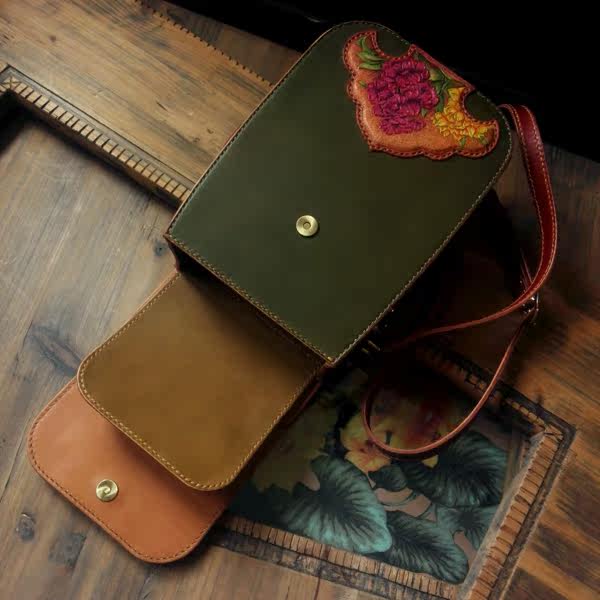 Handmade Tannic Bull Leather Men's Bags Women's Bags Tailor-made Bull Leather Sculptures Flowers painted Violet Women's Oblique Satchel