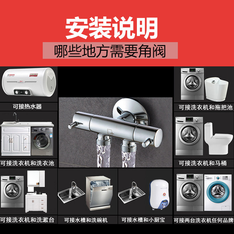 Three-way angle valve can be connected to two 4-point inlet pipe to send raw material belt to send four-point connector can be connected to four-point washing machine and four-point inlet pipe to send six-point connector can be connected to six-point washing machine and four-point inlet pipe to send six-point connector can be connected to six-point washing machine and four-point inlet pipe to send