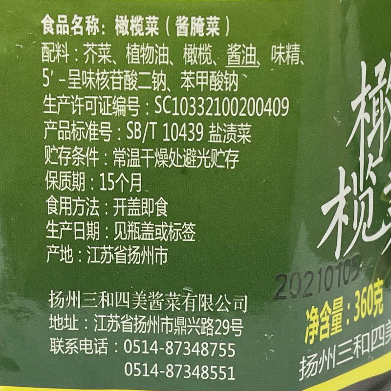 Three-and-four-beauty sauce Zhonghua Lao character pickled pickled vegetable Yangzhou specific in olive vegetables Next meal 360g large bottled