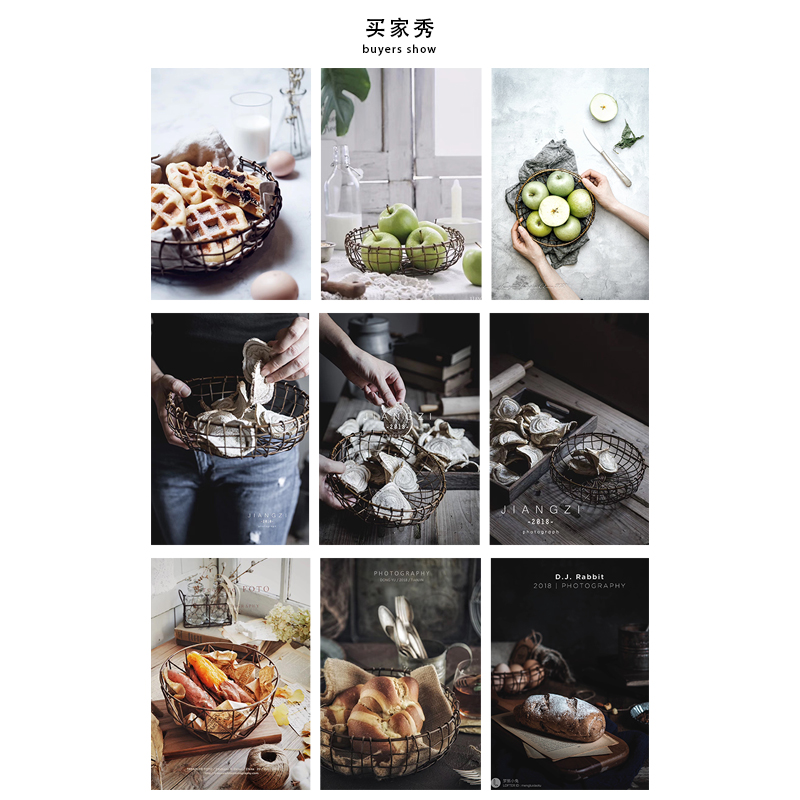 Retro hand-made wrought iron round storage basket bronze fruit basket egg basket gourmet photography props