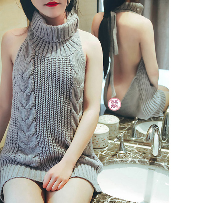 Sexy Back Flip Collar Sweater Knit Loose Open Gear Short Skirt Sleeveless High Collar Uniform Nightclub Nuptiest Anecdotes Underwear
