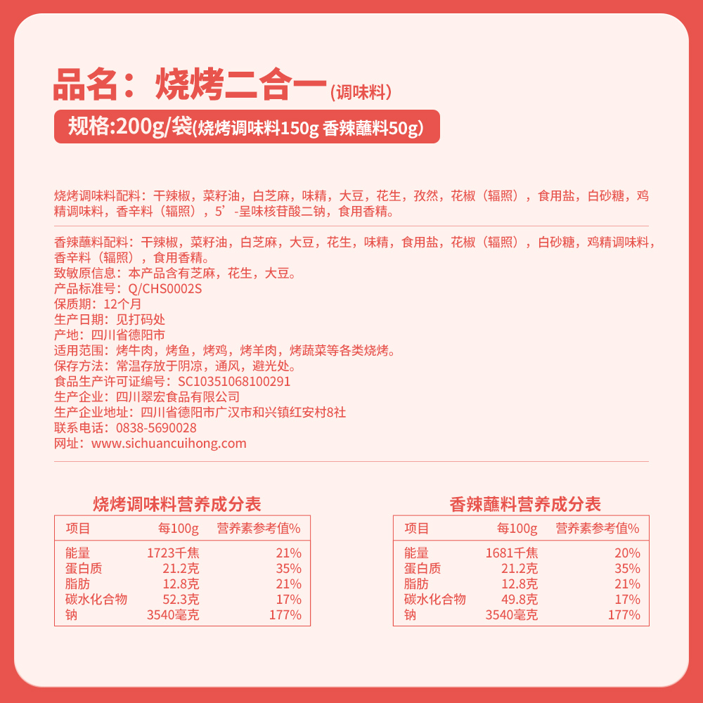 Cuihong BBQ Seasoning Combination 200g Chili Noodles Outdoor BBQ Meat Dipping Sprinkles Home Sichuan Dry Dish Sea Pepper Noodles