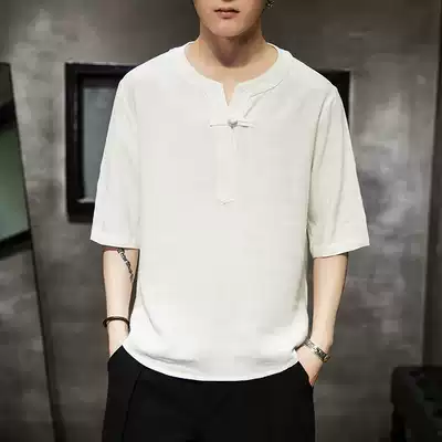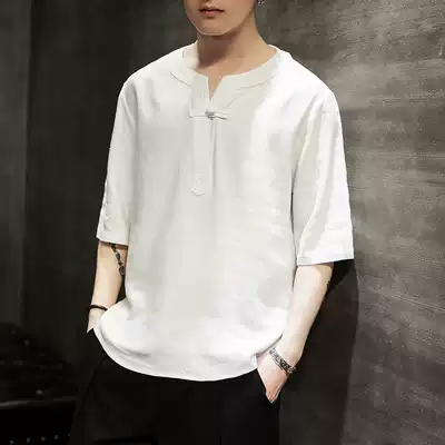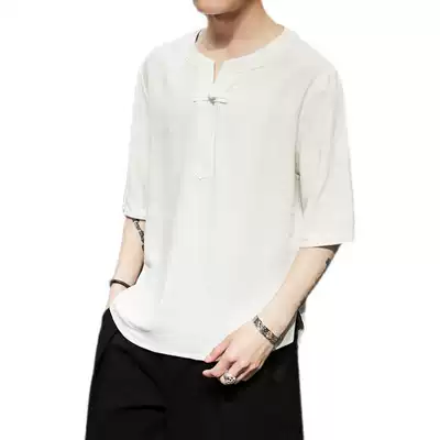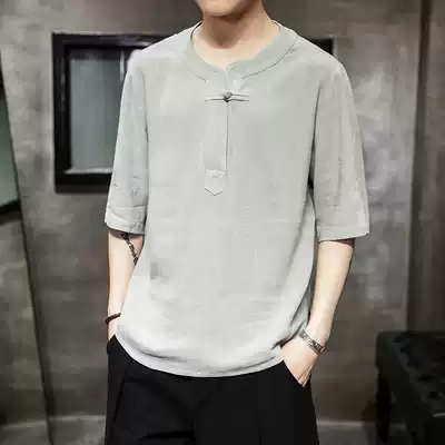 Chinese style men's Chinese linen short sleeve Tang suit large size plate buckle hemp material T-shirt male ethnic style embroidery wide pine summer