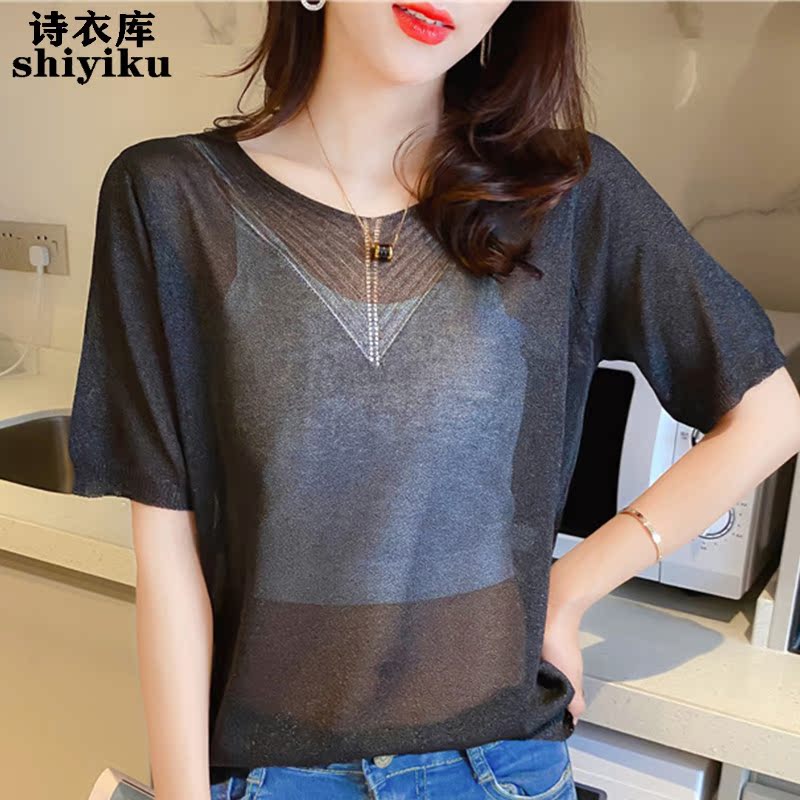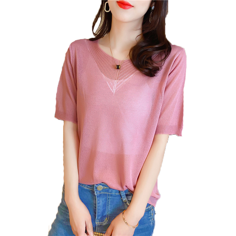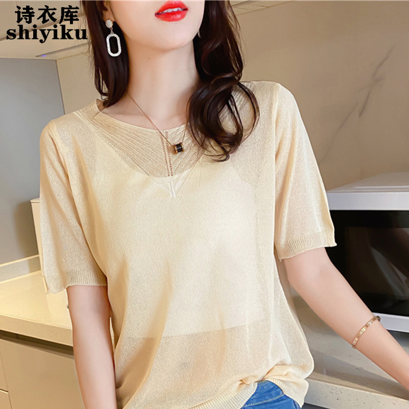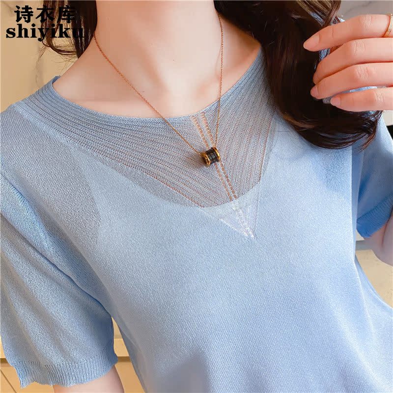 T-shirt women's short-sleeved ice silk top 2022 spring and summer new hollow knitted sweater loose summer blouse sunscreen shirt tide