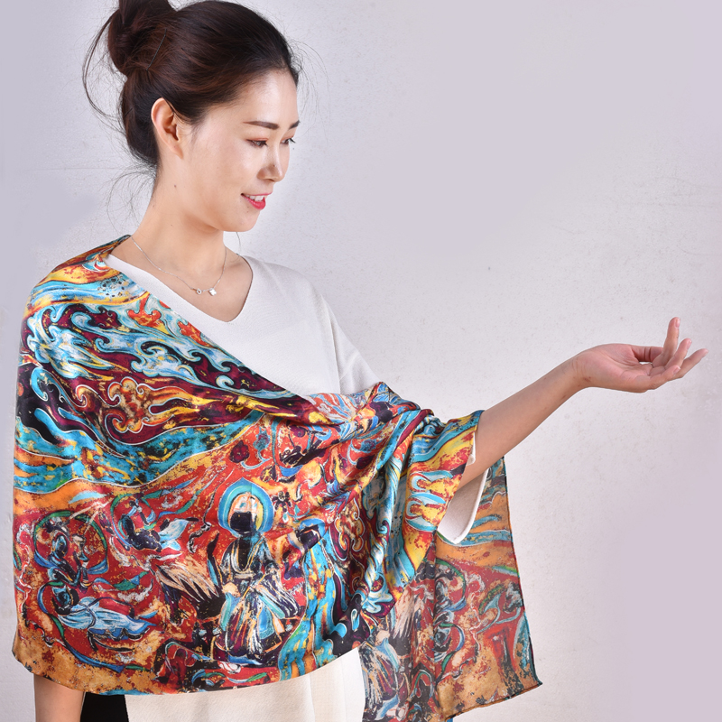 Dunhuang Murals Real Silk Scarves Women Ethnic Wind Scarves Pure Samese Silk Scarlet Dual Use Silk Scarves