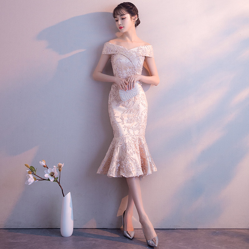 Lined with shoulder bridesmaids 2021 new fish tails Long version Lean Temperament Gathering Foreign Banquet Small Evening Gown