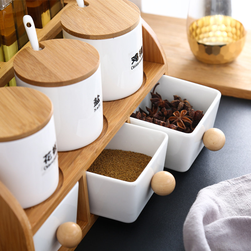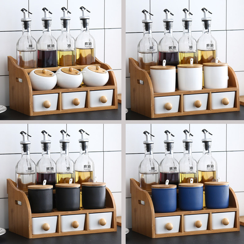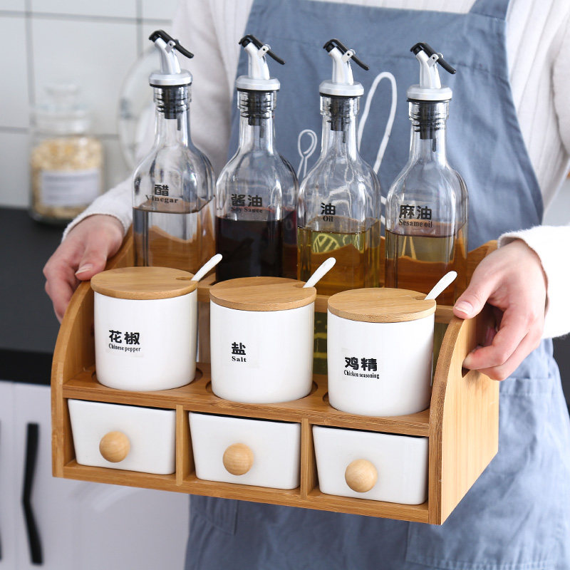 Home Seasoned box Kitchen Ceramic Seasoning Jar Combined Suit Glass Oil Bottle Oil Salt Soy Sauce Vinegar Jar Double seasoning jar rack