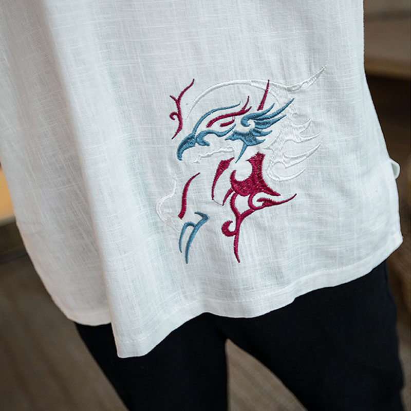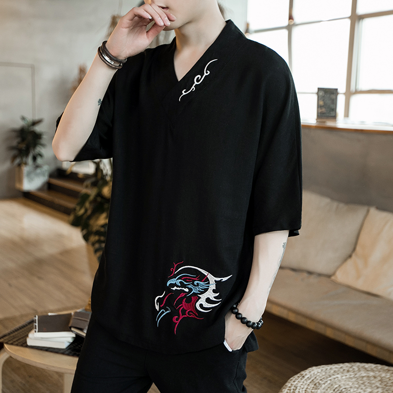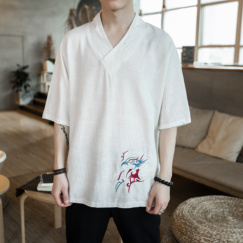 Chinese style Tang costume improved Hanfu embroidered linen mens summer Chinese cotton short-sleeved young layman national costume