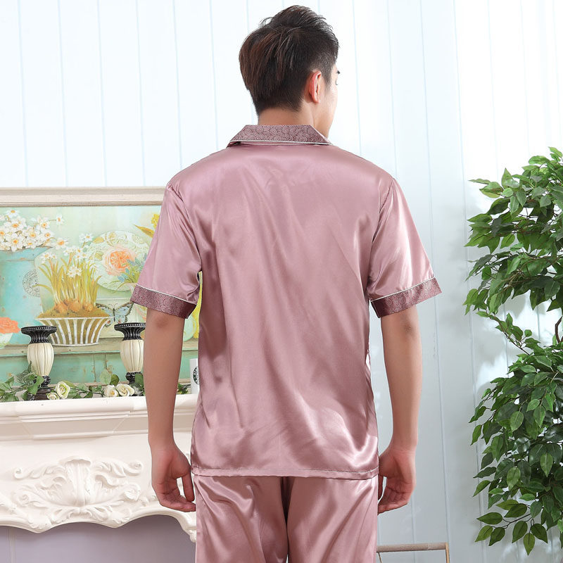 Men's summer simulation silk ring ring printed small turning neckline silhouette short sleeve long pants home conserved silk pyjamas suit