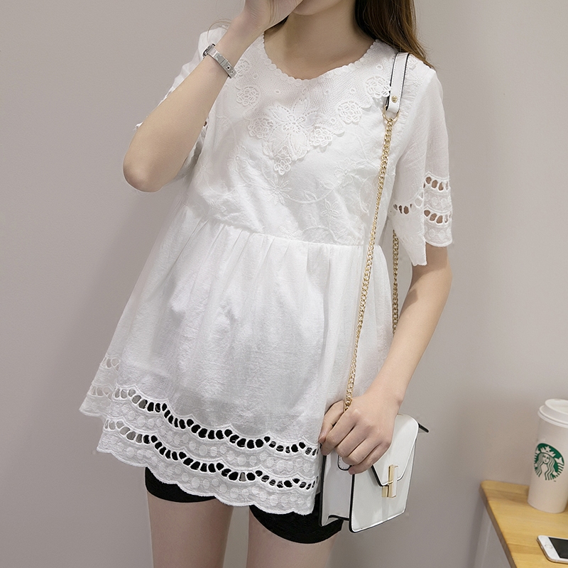 Pregnant woman short sleeve tops summer dress new round collar shirt in long white shirt loose cotton embroidered doll