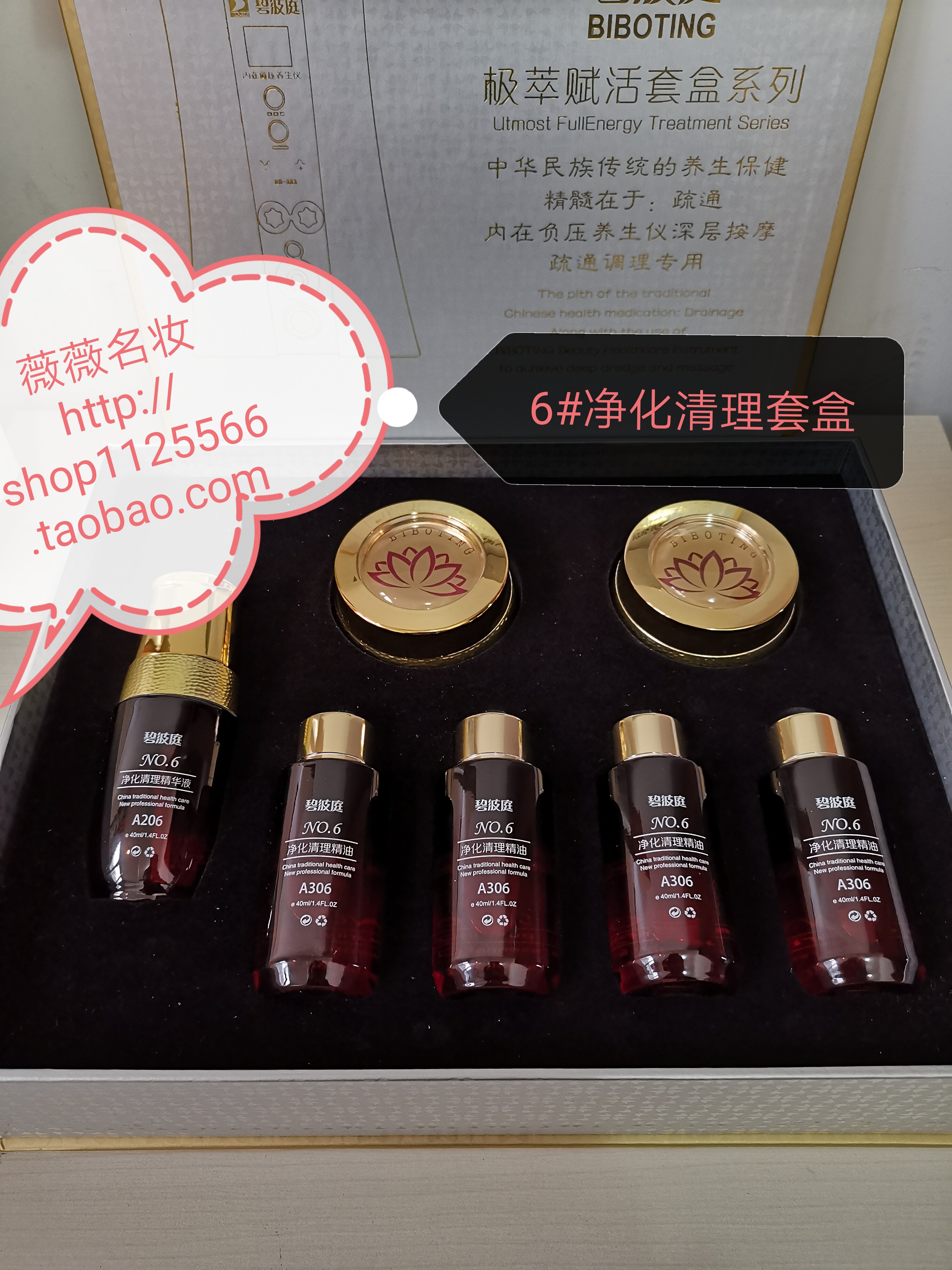 There are plastic sealed Bibo Ting 6# purification and cleaning essential oil kit set facial massage scraping