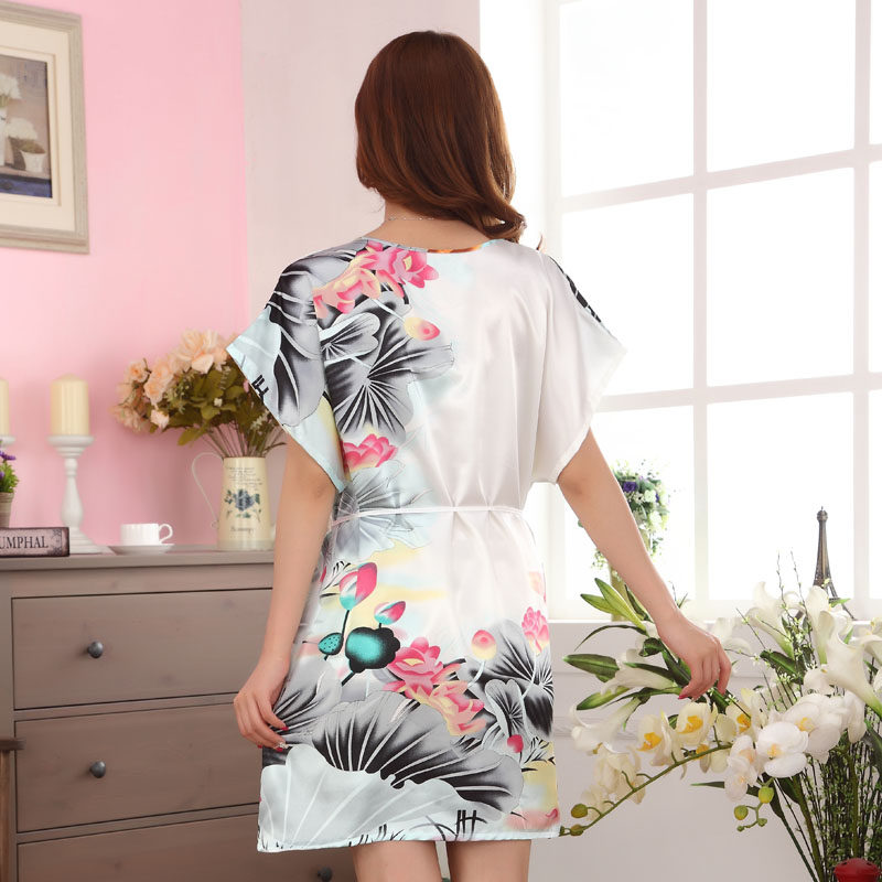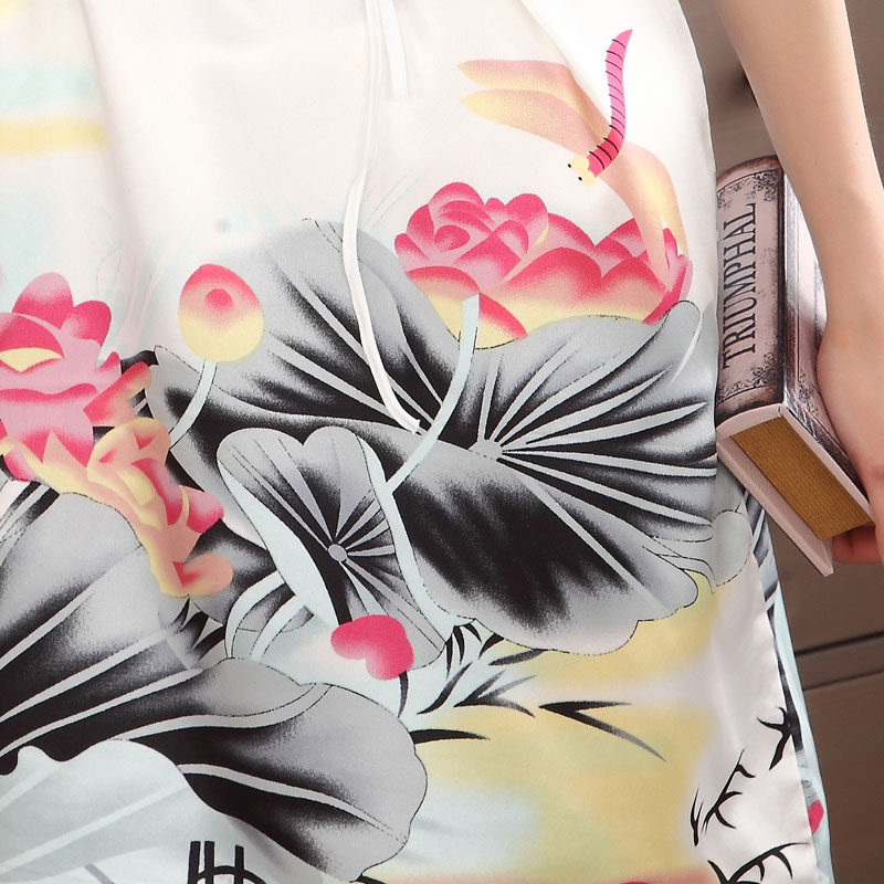 (manufacturer direct sales) loose short sleeve printed bat-shirt round collar lacing silk sleeping dress ink lotus flower