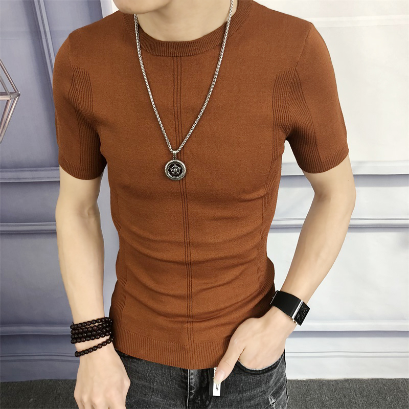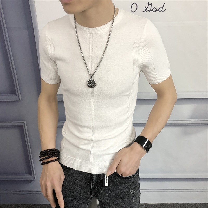 Summer Ice Silk solid color Korean slim men's round neck short sleeve T-shirt Hong Kong style trend thin half sleeve knitted sanitary clothes