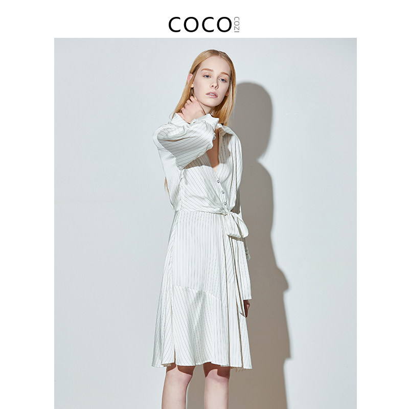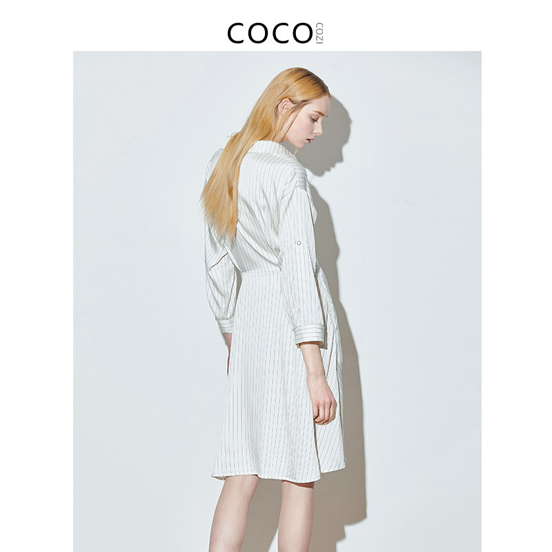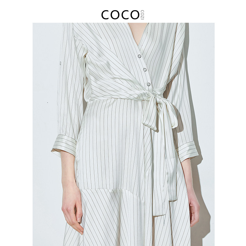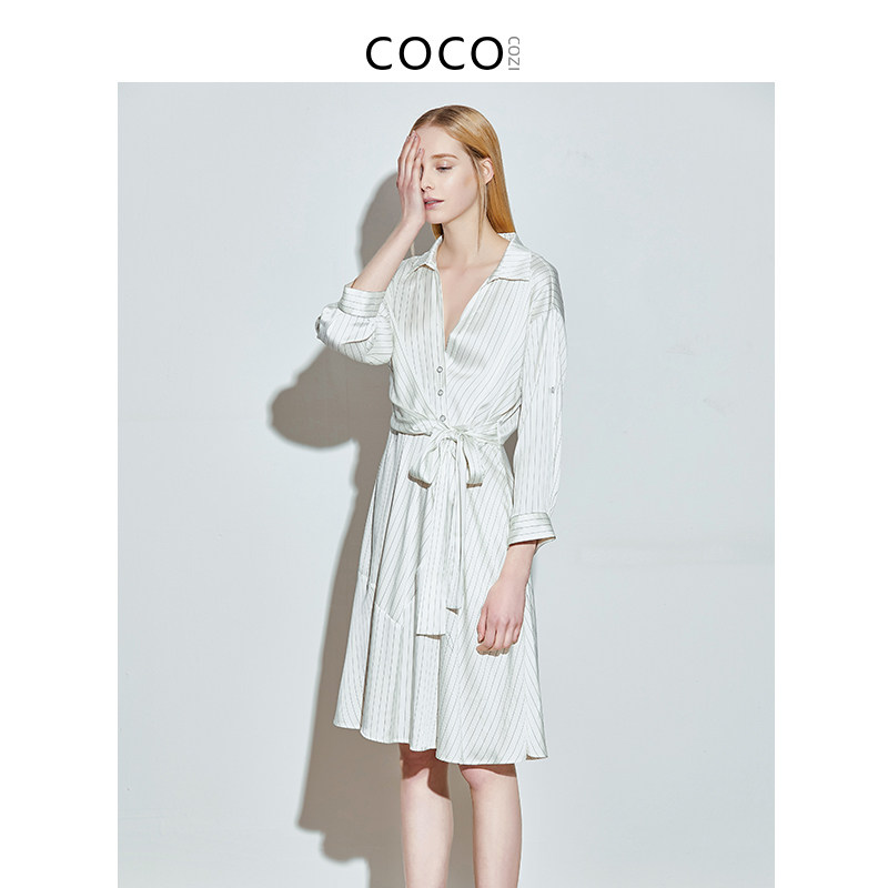 COCOCOZI soft shadow (silk) mulberry silk striped waist dress female summer heavy silk shirt female