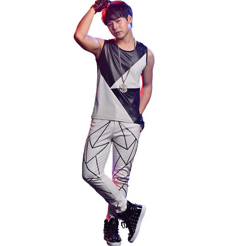 Bar Nightclub Tide male singer performing clothes custom black and white splicing punched porous vest