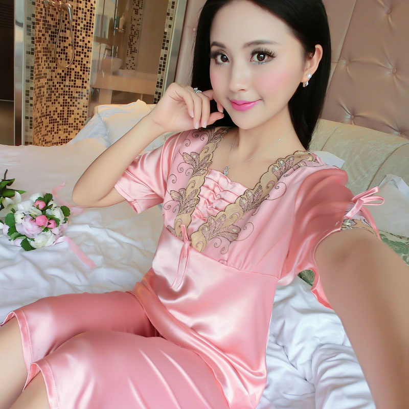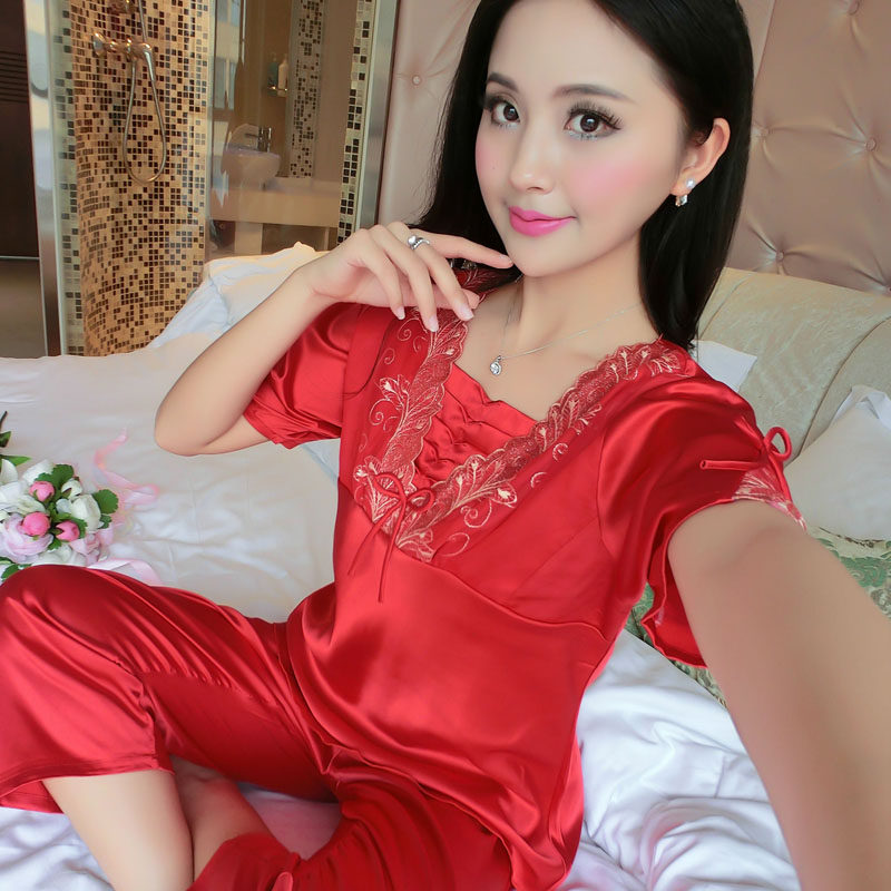 Pajamas women's summer simulation silk short-sleeved five-point pants two-piece suit silk home clothes thin section sexy silk spring and autumn