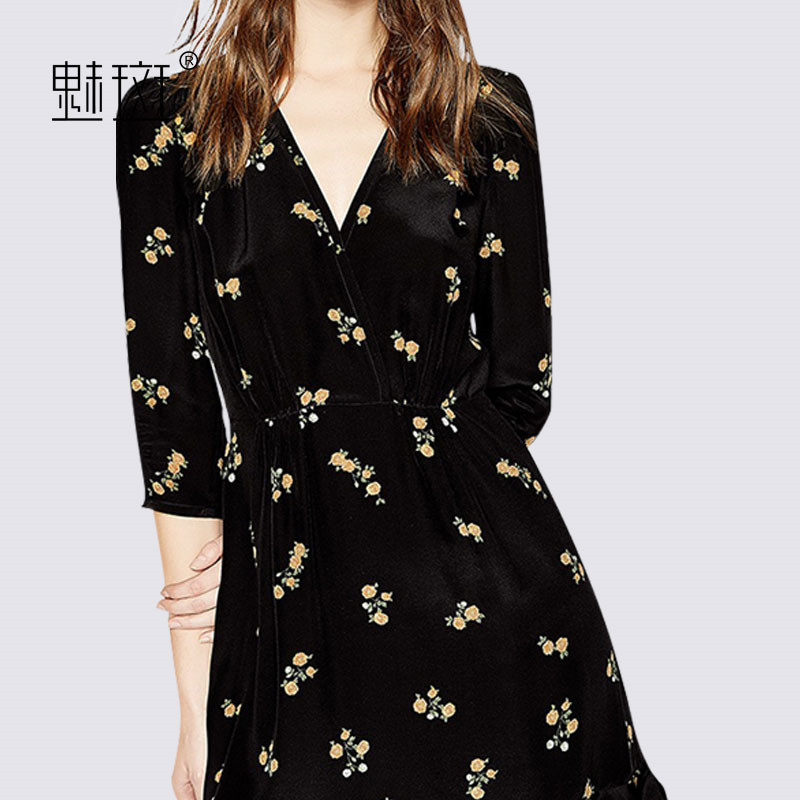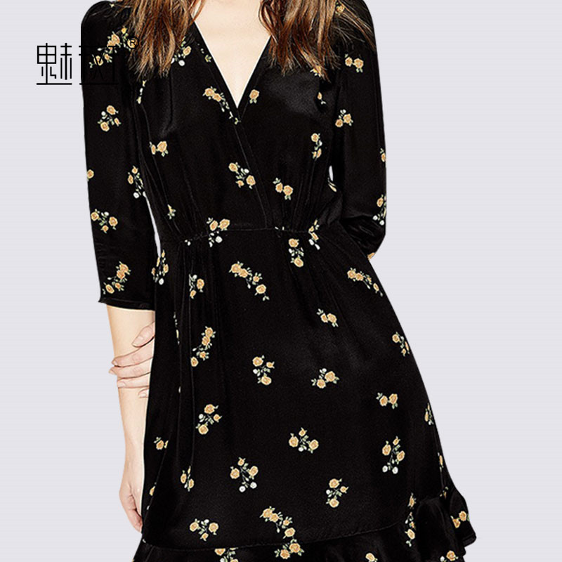 charm spot 2021 summer new V-neck three-point sleeve floral chiffon dress women's printing stitching ruffle A-line skirt