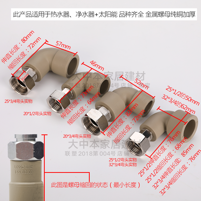 Liansu PPR water heater 4 points Guangdong Liansu PPR all copper thickened nut live direct elbow three-way water pipe