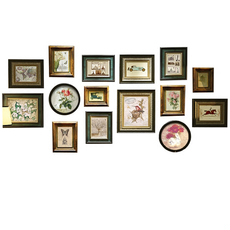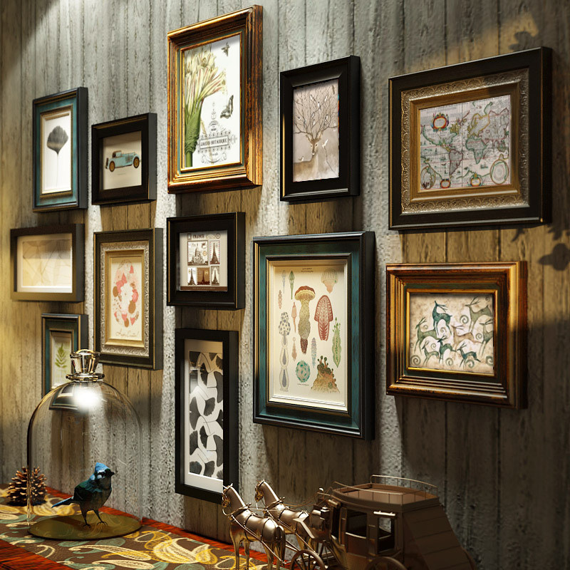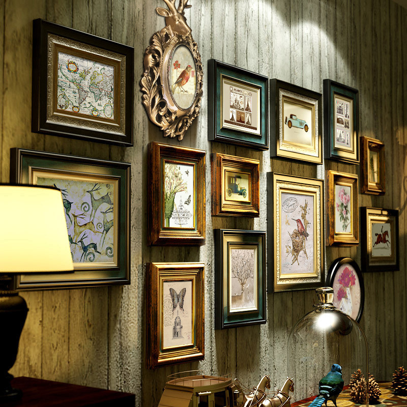 Light luxury American solid wood photo wall decoration living room deer photo frame free punching European retro photo hanging wall combination painting