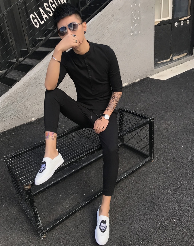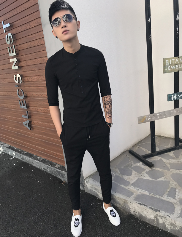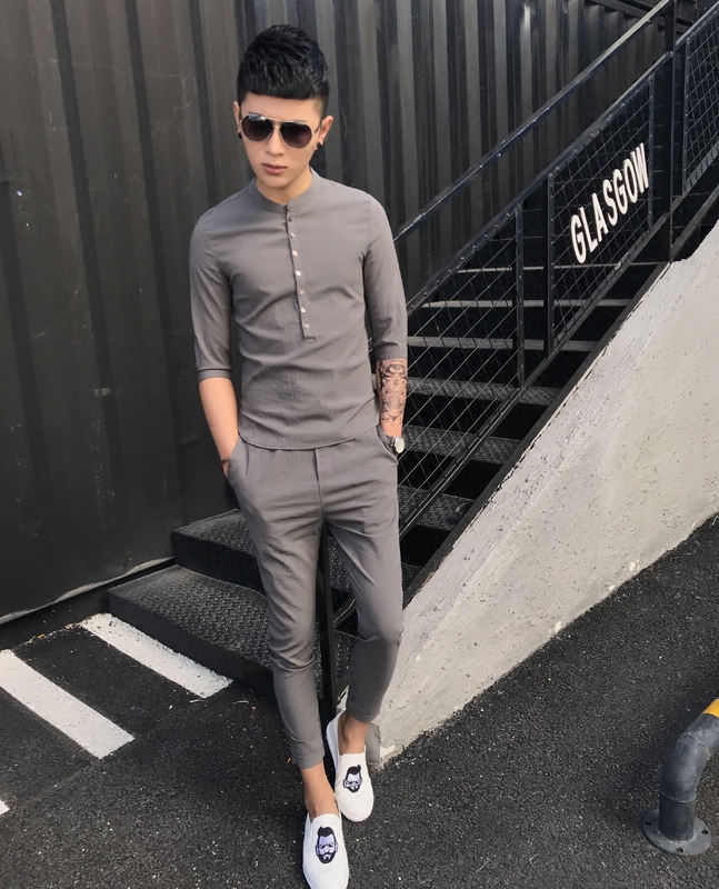 Men's suits with handsome and slim fashion short-sleeved two-piece casual trend summer cotton and linen sports suits