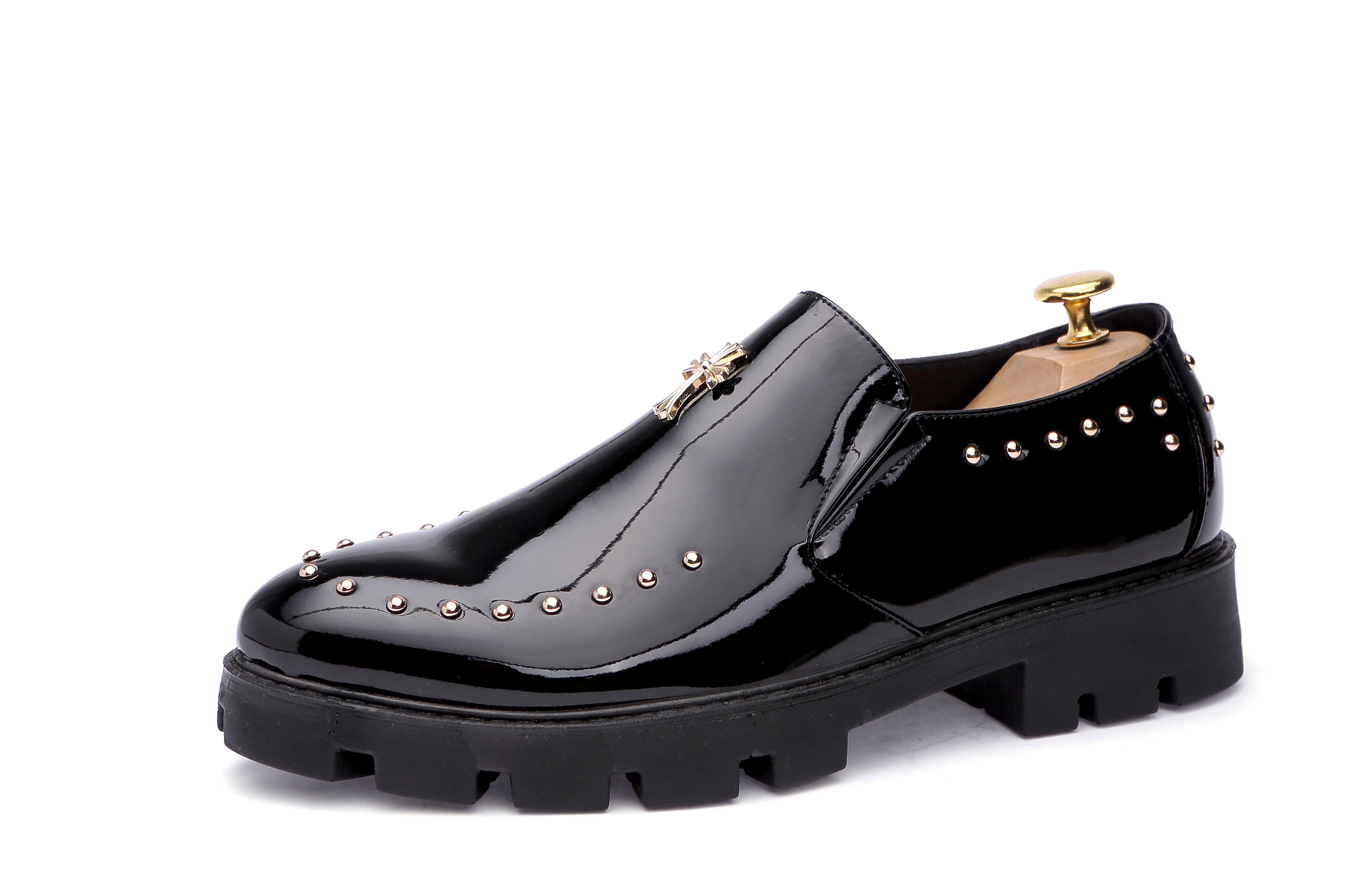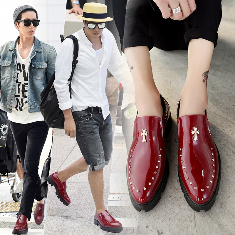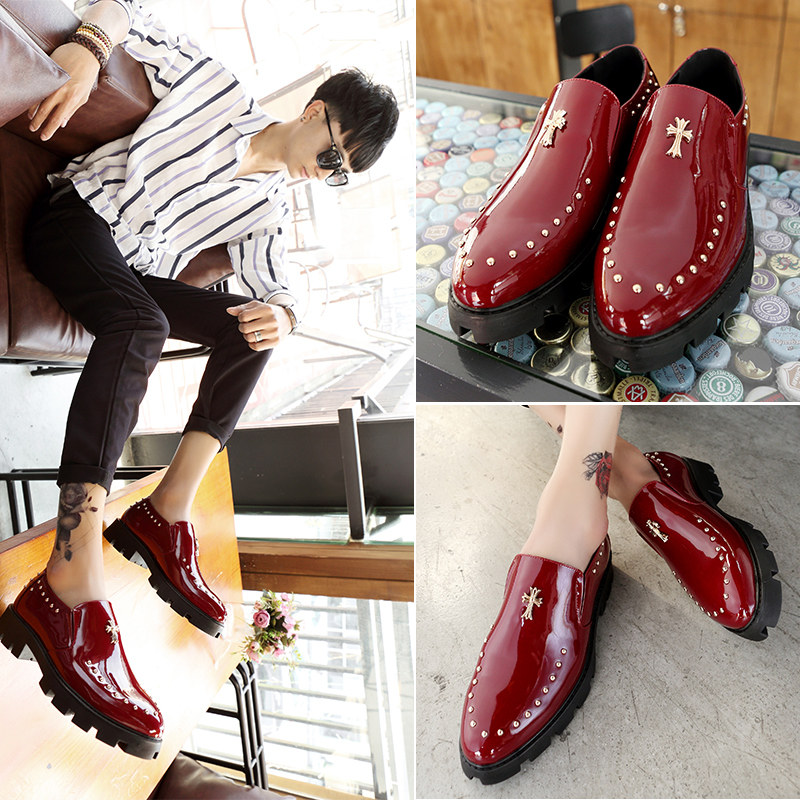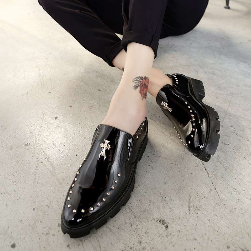 Pointy leather shoes Men's Inn trendy nightclub Personality Rivets Leather Shoes Hair Stylist Bright Leather Heightening Leather Shoes Thick bottom men's shoes