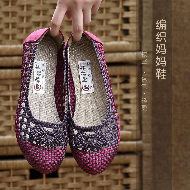 Old Beijing cloth shoes women's flat woven shoes summer hollow breathable mother sandals middle-aged and elderly non-slip soft sole shoes
