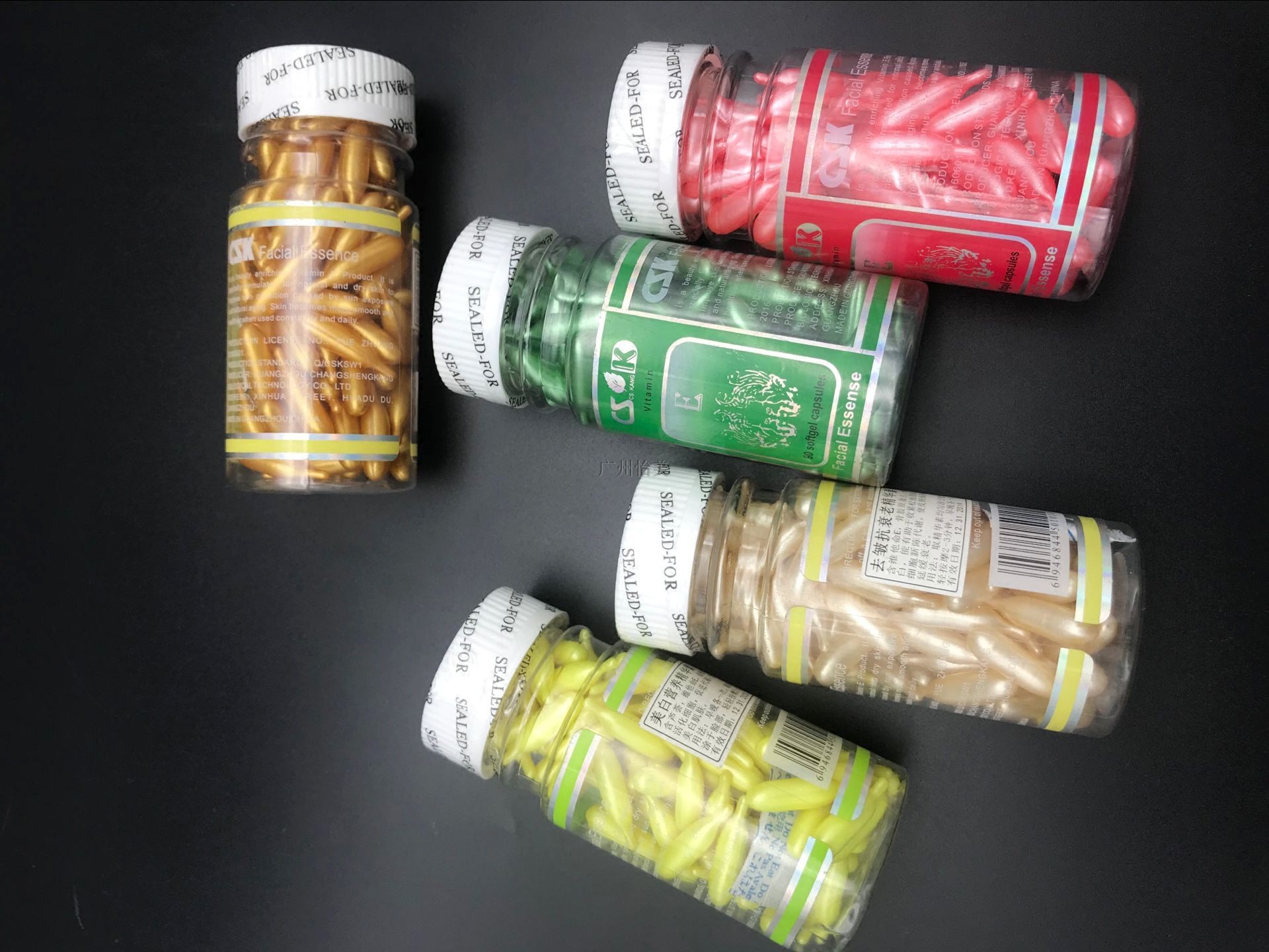 Skin rejuvenation and moisturizing (pink) two hair three white nutrition (yellow) two hair three wrinkle anti-aging (silvery white) two hair three spot whitening (gold) two hair three acne (green) two