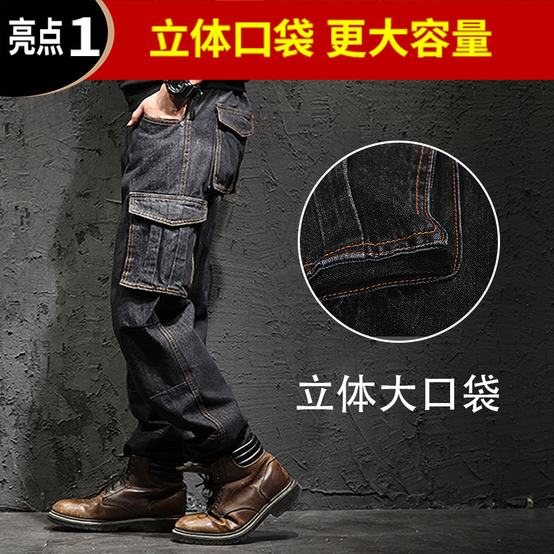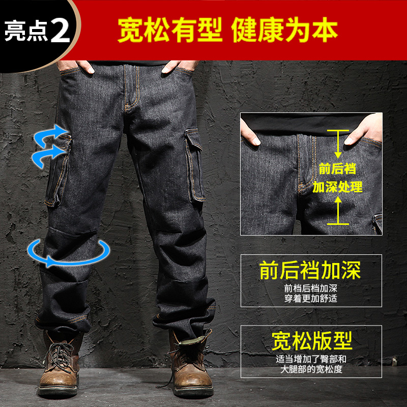 Autumn and winter multi-pocket overalls jeans men's loose straight plus fat plus size fat men's long pants tide