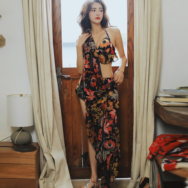 Bikini women's three-piece sexy small chest gathered steel support retro hot spring small fragrance beach swimsuit