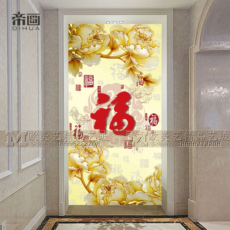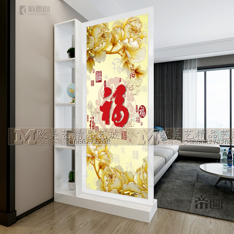 Custom New Chinese Art Glass Partition Screen Xuanguan Cabinet Living Room Background Wall Frosted Steel Chemical Technique Peony Fu