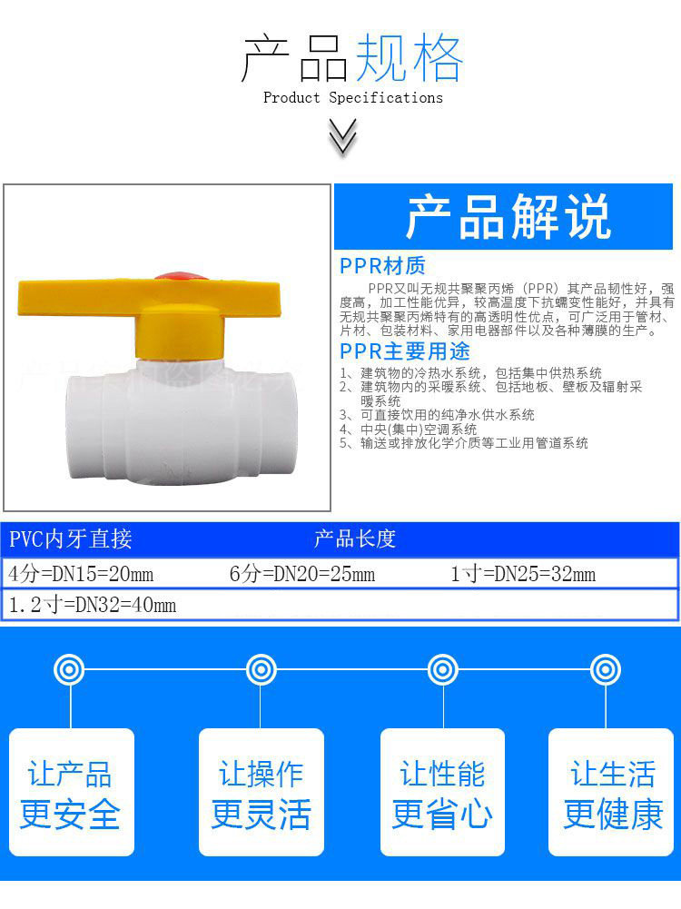 20mm (4 points)PPR double internal thread steel core ball valve 25mm (6 points)PPR double internal thread steel core ball valve 32mm(1 inch)PPR double internal thread steel core ball valve 40mm(1 inch) PPR double internal thread steel core ball valve 40mm (1 inch) PPR double internal thread steel core ball valve 40mm (1 inch) PPR double internal thread steel core ball valve