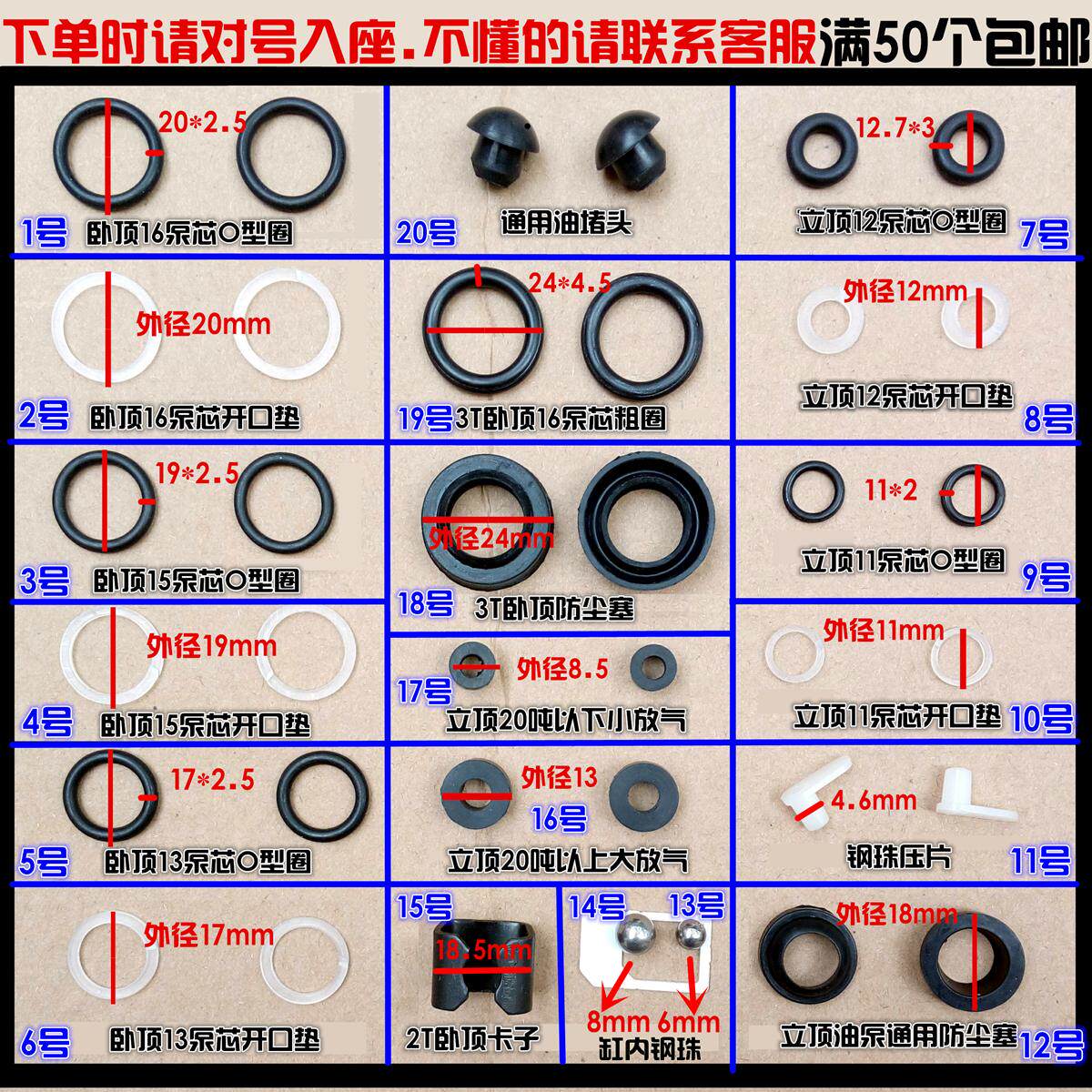 No. 13 refined 6mm steel ball No. 1 horizontal roof 16 pump core O-ring No. 11 standing top steel ball press sheet 20 jack general oil plug No. 2 horizontal roof 16 pump core opening pad 12 standing roof general dustproof 15 2 tons of horizontal roof special card No. 10 standing top 11 pump core opening pad No. 4 sleeping roof 15 pump core opening pad 5 horizontal roof 13 pump core O-ring No. 8 vertical top 12 pump core opening pad 16 standing top 20 tons or more large deflation 7 standing top 12 pump core O-ring 9 standing top 11 pump core O-ring 17 vertical roof 20 tons or less small deflation 3 horizontal roof 15 pump core O-ring 14 refined 8mm steel ball No. 19 3T horizontal roof 16 pump core thick ring 6 horizontal roof 13 pump core open Mouth pad No. 18 3T Horizontal roof 16 pump core dust plug