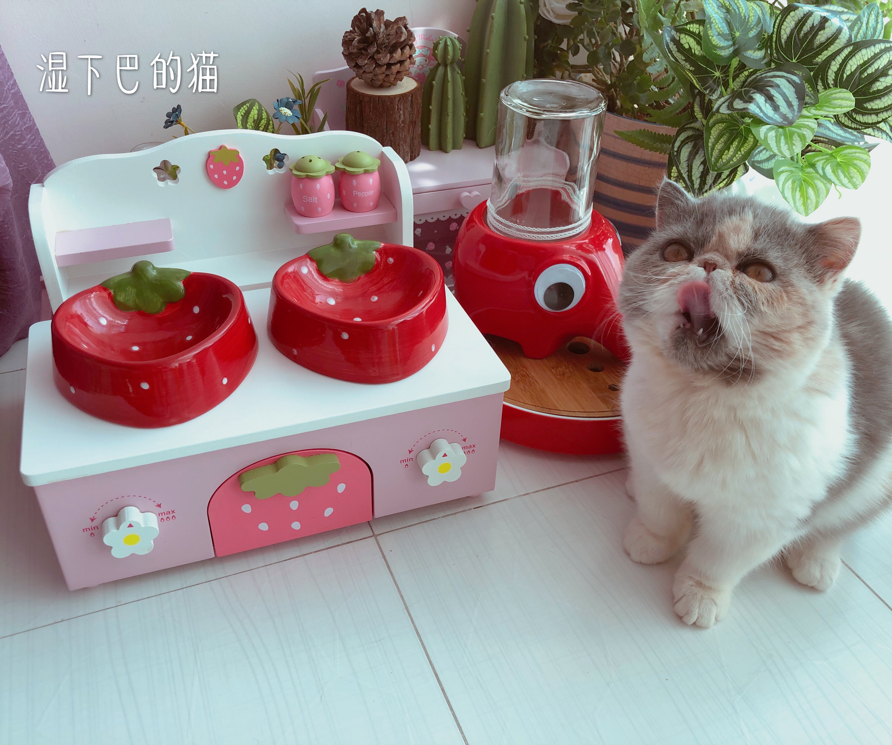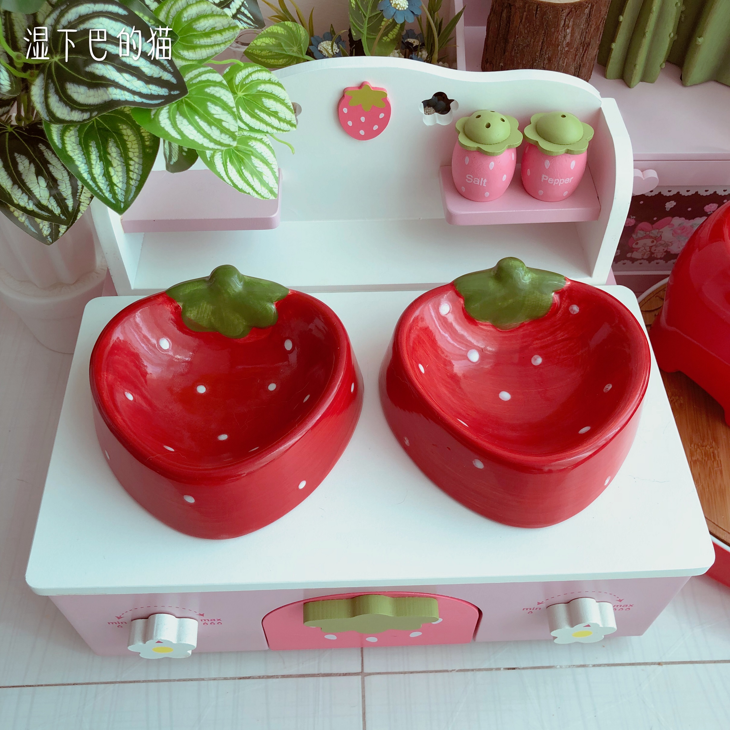 Cute Strawberry Cat Bowl Rack Pet High Foot Table Pooch Ceramic Bowl Solid Wood Bowl Rack Pet Table Goods Gaffi