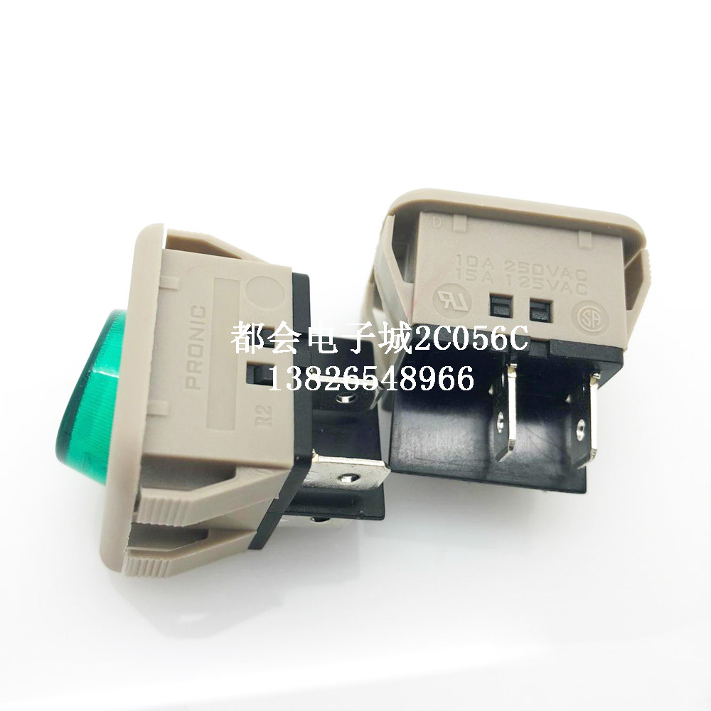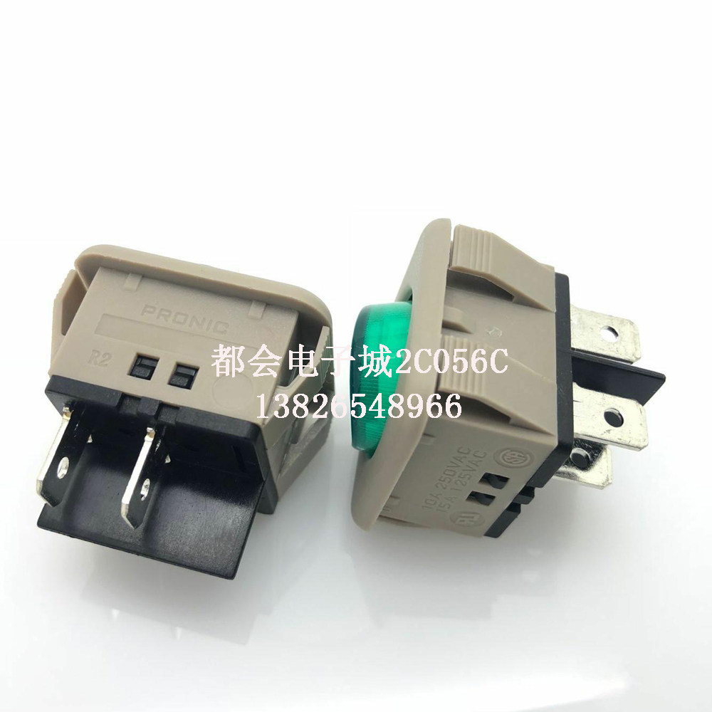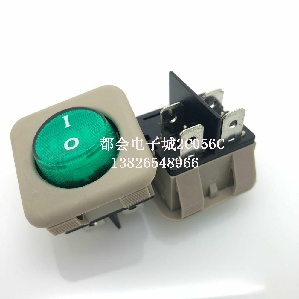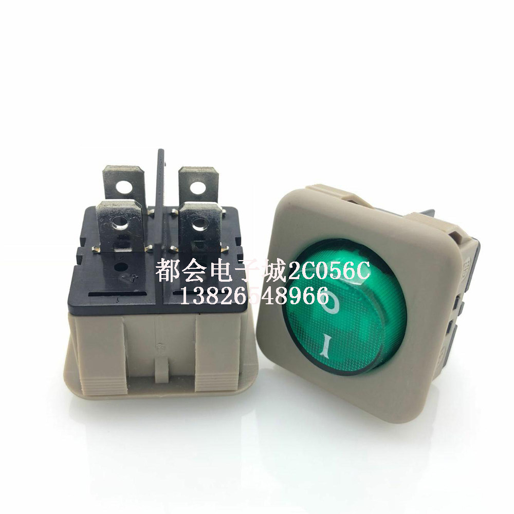 Rocker switch 10A250V High power green light four feet two stalls 30 * 30mm square switch JHD-9905